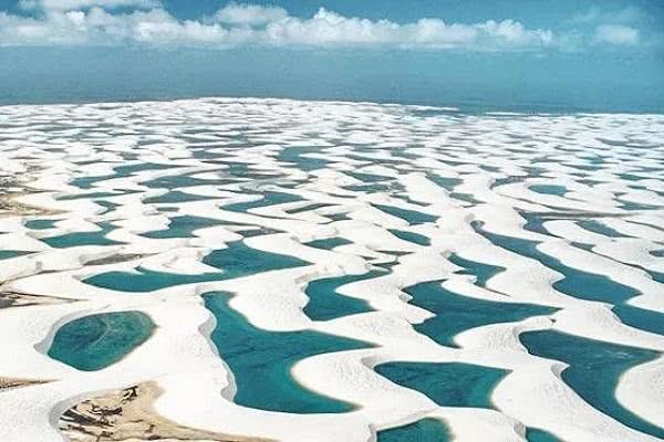 在巴西的拉克斯马拉尼什沙漠有一个神奇的地方。雨季到来时,将会有成千上万个湖泊的奇妙景象。在旱季,这些绿色的湖泊将再次消失,恢复到沙漠的原始面貌。在白色的沙丘上,有一个又一个晶莹的蓝色湖泊。沙漠和湖泊相互交错。数千个沙丘和数千个湖泊排列在一起,形成了数千个湖泊的景象。